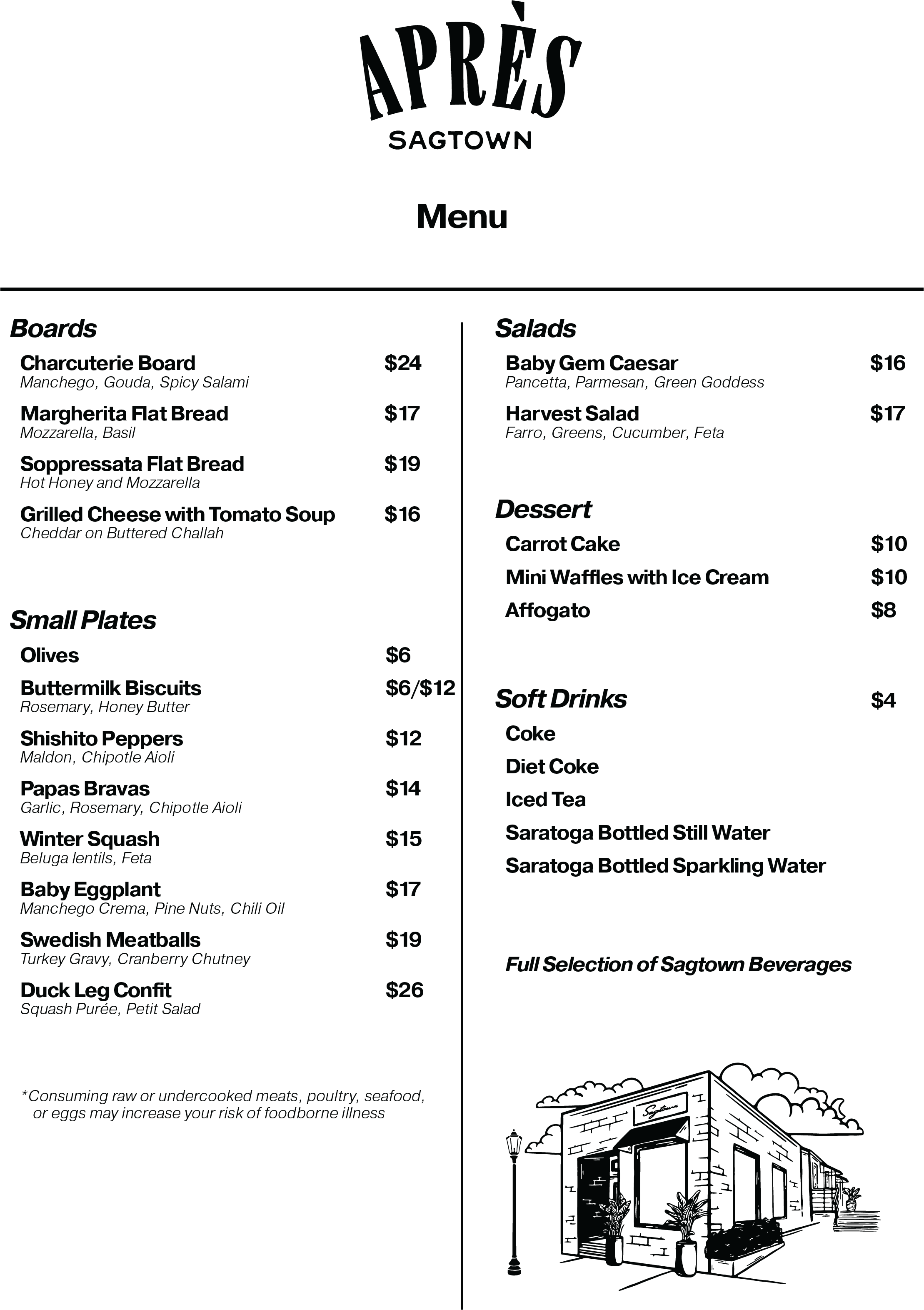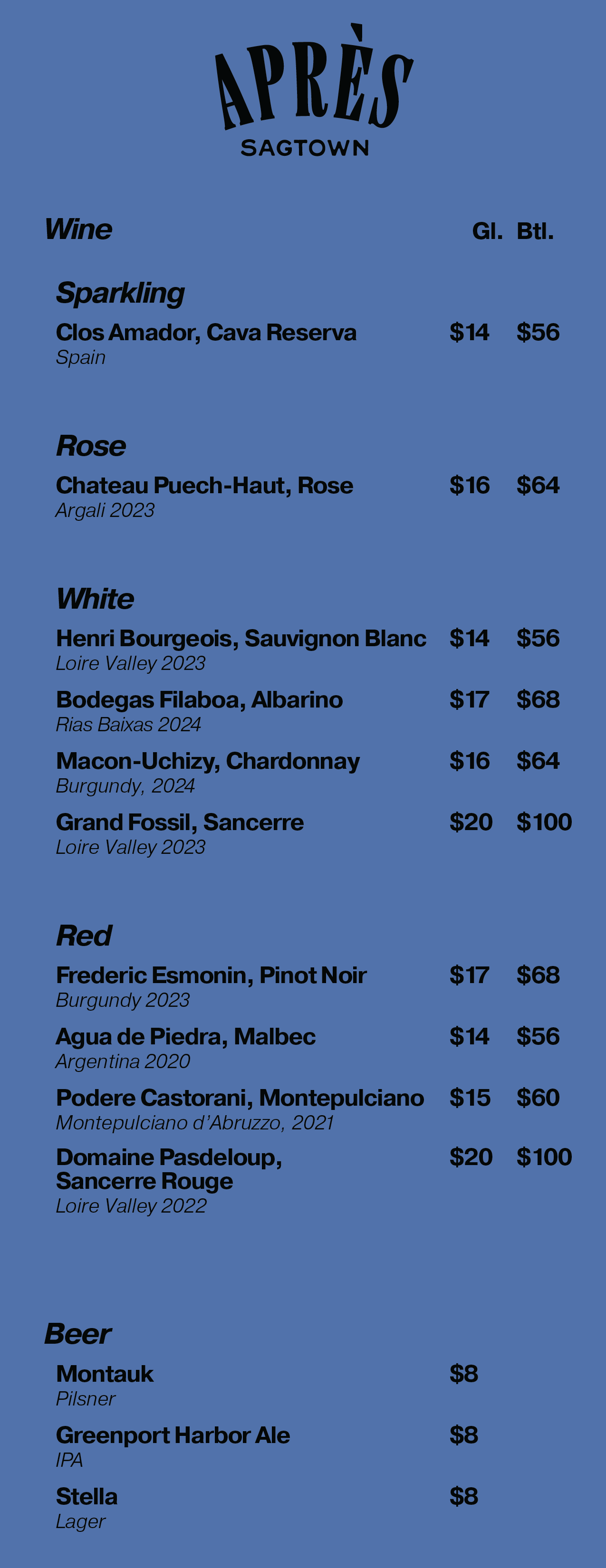 We’re excited to announce Sagtown Apres - Thursdays, Fridays, & Saturdays 5 pm - 10 pm. Enjoy a laid-back evening filled with delicious wine, refreshing beer and small plates. It’s the perfect place to unwind and catch up with friends in a relaxed atmosphere.